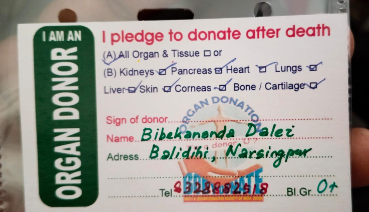 କଟକ :-ବାଲିଡିହ ନରସିଂହପୁର ର ଯୁବ ସମାଜସେବୀ ବିପଦର ବନ୍ଧୁ ବିବେକାନନ୍ଦ ନାମରେ ସାରା ଓଡିଶା ରେ ପରିଚିତ!ତାଙ୍କ ବାପା ଙ୍କ ୧୦ମ ଶ୍ରାଦ୍ଧ ବାର୍ଷିକ ଅବସରରେ ନିଜର ସବୁ ଅଙ୍ଗ ସମାଜ ଅଫିସ ରେ ଡାକ୍ତର ପ୍ରଭାସ ଆଚାର୍ଯ୍ୟ ସାର ଙ୍କ ମାଧ୍ୟମରେ ସମାଜ ପାଇଁ ଉତ୍ସର୍ଗୀକୃତ କରିଛନ୍ତି | ଅଙ୍ଗଦାନ କରିବାର ମୁଖ୍ୟ ଉଦ୍ଦେଶ୍ୟ କାରଣ ବାପା ମଧ୍ୟ କିଡ଼ନୀ ରୋଗ ରେ ମୃତ୍ୟୁବରଣ କରିଥିଲେ ସେ ସମୟ ରେ ହୁଏତ କେହି ଅଙ୍ଗଦାନ କରିଥିଲେ ଆଜି ବାପା