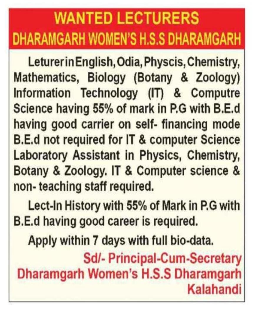 ଧର୍ମଗଡ ମହିଳା ଉଚ୍ଚ ମାଧ୍ୟମିକ ବିଦ୍ୟାଳୟ ରେ ଅଧ୍ୟାପକ ଅଧ୍ୟାପିକା ନିଯୁକ୍ତି ପାଇଁ ଚଞ୍ଚକତା।