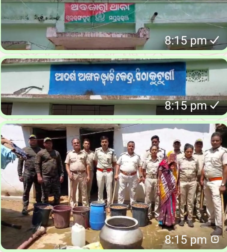 ରାଇରଙ୍ଗପୁର ଅବକାରୀ ବିଭାଗ ତରଫରୁ କୁଦର ସାହି ଓ ପିଠାକୁଟୁଣୀ ଗାଁ ରେ ଚଢ଼ାଉ ;୫,୫୦୦ ଲିଟର ମଦ ,ପୋଚ,ରନ୍ଧା ସାମଗ୍ରୀ,୨୬୫ ଲିଟର ଦେଶୀମଦ ଜବତ ସମେତ ୨ ଜଣଙ୍କୁ କୋର୍ଟ ଚାଲାଣ