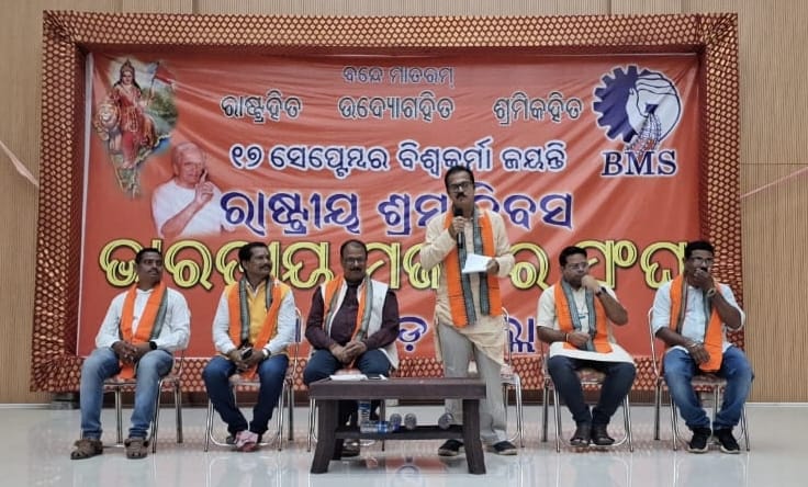 କରାଯାଇଥିଲା । ଉକ୍ତ କାର୍ଯ୍ୟକ୍ରମ ପ୍ରାରମ୍ଭରେ ଭଗବାନ ବିଶ୍ଵକର୍ମା , ଭାରତ ମାତା , ସଂଘର ପ୍ରତିଷ୍ଠାତା ଦତ୍ତୋପନ୍ତ ଠେଙ୍ଗଡୀ ଜିଙ୍କ ଫଟୋ ଚିତ୍ର ରେ ପୂଷ୍ପ ଦ୍ଵିପ ପ୍ରଜ୍ବଳନ କରି , ଶ୍ରମିକ ଗୀତ ଗାନ କରା଼ଯାଇ ସାରା ଦେଶରେ ମୃତ୍ୟୁ ବରଣ କରିଥିବା ସମସ୍ତ ଶ୍ରମିକ ଭାଇ ଭଉଣୀ ମାନଙ୍କ ଉଦ୍ଦେଶ୍ୟରେ ୨ ମିନିଟ ନିରବ ପ୍ରାର୍ଥନା କରାଯାଇଥିଲା। ଉକ୍ତ କାର୍ଯ୍ୟକ୍ରମରେ ମୁଖ୍ୟ ଅତିଥି ଭାବେ ଭାରତୀୟ ମଜଦୂର ସଂଘ ର ରାଜ୍ୟ ସଭାପତି ଶ୍ରୀ ବାଦଲ କୁମାର ମହାରଣା , ମୁଖ୍ୟ ବକ୍ତା ଭାବେ ରାଷ୍ଟ୍ରୀୟ ସ୍ବୟଂ ସେବକ ସଂଘ ସକ୍ଷମ ର ପଶ୍ଚିମ ପ୍ରାନ୍ତଃ ସଂରକ୍ଷକ ତଥା ଓଡ଼ିଶା କର୍ମଜୀବୀ ସାମ୍ବାଦିକ ସଂଘ ର ରାଜ୍ୟ ସଭାପତି ଶ୍ରୀ ବାଦଲ ତା, ସମ୍ମାନିୟ ଅତିଥି ଭାବେ ରାଷ୍ଟ୍ରୀୟ ସ୍ଵୟଂ ସେବକ ସଂଘ ର ନଗର କାର୍ଯ୍ୟବାହ ଶ୍ରୀ ବିଦ୍ୟାଭୂଷଣ ପଣ୍ଡା , ଇମ୍ପା କାରଖାନାର ବରିଷ୍ଠ ଲୋକସଂପର୍କ ଅଧିକାରୀ ଶ୍ରୀ ଶକ୍ତି ପ୍ରସାଦ ପାଣିଗ୍ରାହୀ , ଶ୍ରମିକ ନେତା ତଥା ଭାରତୀୟ ମଜଦୁର ସଂଘ ର ରାଜ୍ୟ ସମ୍ପାଦକ ଶ୍ରୀ ଯୋଗେଶ୍ଵର ଦାସ ଯୋଗ ଦେଇ ଭାରତୀୟ ବିଚାର ରେ ଭାରତ ଗଠନରେ ଏକ ଅଣ ରାଜନୈତିକ କେନ୍ଦ୍ରୀୟ ଶ୍ରମିକ ସଙ୍ଗଠନ ହୋଇ ଶ୍ରମିକ ମାନଙ୍କ ସମସ୍ତ ସମସ୍ୟାର ସମାଧାନ କରିବା ସହ ଭାରତୀୟ ବିଚାର ରେ ସମର୍ପିତ ହୋଇ ଶୃଙ୍ଖଳିତ ଭାବେ ନିଜର କର୍ମମୟ ଜୀବନ ମଧ୍ୟରେ ଭାରତୀୟ ବିଚାର ଧାରାରେ ରାଷ୍ଟ୍ରହିତ , ଉଦ୍ୟୈ।ଗହିତ , ଶ୍ରମିକହିତ ଏବଂ ତ୍ୟାଗ ତପସ୍ୟା ଆଉ ବଳିଦାନ କୁ ଦୃଷ୍ଟିରେ ରଖି ଭାରତୀୟ ମଜଦୁର ସଂଘ କୁ ସାରା ଦେଶରେ ପ୍ରଥମ ସ୍ଥାନ ଅଧିକାର କରିବା ରେ ଶ୍ରମିକ ମାନଙ୍କ ଯେଉଁ ଅବଦାନ ରହିଛି ତାକୁ ସମ୍ମାନ ଦେବା ସହିତ , ମାତୃ ଶକ୍ତି ଆଜିର ଦିନରେ ନିଜ ପରିବାର, ନିଜ କର୍ମମୟ ଜୀବନ ମଧ୍ୟରେ ଭାରତୀୟ ମଜଦୁର ସଂଘ କୁ ଆଗକୁ ନେବାରେ ପାରଦର୍ଶିତା ରଖିଥିବାରୁ ଭୂୟସୀ ପ୍ରଶଂସା କରିବା ସହ ସମ୍ମାନ ଜଣାଇ ଥିଲେ। ସରକାର ଆଜିର ଦିନରେ ଅଙ୍ଗନୱାଡ଼ି କର୍ମୀ , ଆଶା କର୍ମୀ , ପାଚିକା , ପାଚିକା , ଆଶା ସାଥି , ଠିକା ଶ୍ରମିକ , ଅସଂଗଠିତ କ୍ଷେତ୍ରରେ କାର୍ଯ୍ୟ କରୁଥିବା ଶ୍ରମିକ ଭାଇ ଭଉଣୀ ମାନଙ୍କୁ ଅଣଦେଖା କରୁଥିବା ଏବଂ କଳକାରଖାନା ରେ କାର୍ଯ୍ୟରତ ଶ୍ରମିକ ମାନଙ୍କୁ ଛଟେଇ କରାଯାଉଥିବା ଭଳି ବିଭିନ୍ନ ସମସ୍ୟାକୁ ସମାଧାନ କରିବା ପାଇଁ ଦାବି କରିବା ସହ ବିଶ୍ଵକର୍ମା ଜୟନ୍ତୀକୁ ରାଷ୍ଟ୍ରୀୟ ଶ୍ରମିକ ଦିବସ ରୁପେ ଘୋଷଣା କରିବା ପାଇଁ ଦାବି କରିଥିଲେ । ଏହି ଅବସରରେ ରାୟଗଡ଼ା ପ୍ରତିଷ୍ଠିତ ୫ ଜଣଙ୍କୁ ବିଶ୍ଵକର୍ମା ଶ୍ରମ ସମ୍ମାନରେ ସମ୍ମାନିତ କରାଯାଇଥିଲା।