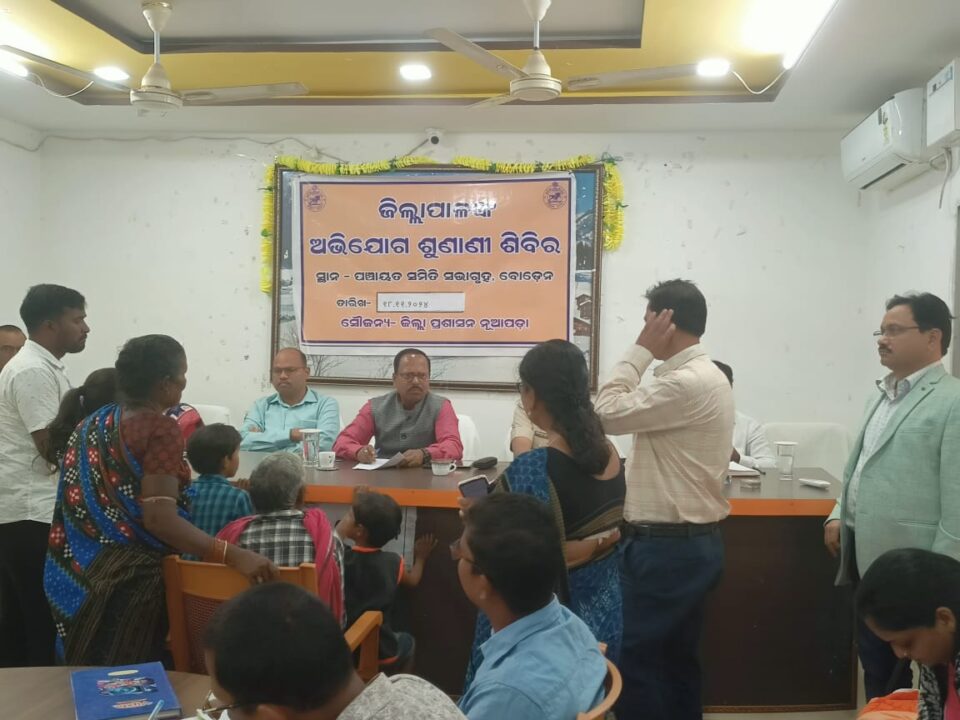 ନୂଆପଡା,ନୂଆପଡ଼ା ଜିଲ୍ଲା ବୋଡ଼େନ ପଞ୍ଚାୟତସମିତି ସମ୍ମିଳନୀ କକ୍ଷଠାରେ ନୂଆପଡା ଜିଲ୍ଲାପାଳଙ୍କ ଜିଲ୍ଲାସ୍ତରୀୟ ଯୁଗ୍ମ ଅଭିଯୋଗ ଶୁଣାଣି ଶିବିର ଅନୁଷ୍ଠିତ ହୋଇଯାଇଛି।