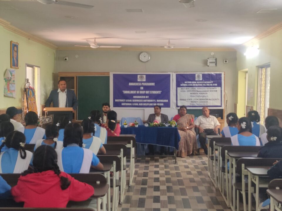 ଜିଲ୍ଲା ଆଇନ୍ ସେବା ପ୍ରାଧିକରଣ ର ଅଧ୍ୟକ୍ଷ ତଥା ଜିଲ୍ଳା ଦୌରା ଜଜ୍ ଶ୍ରୀ ସତ୍ୟନାରାୟଣ ଷଡଙ୍ଗୀ ଙ୍କ ପରାମର୍ଶ କ୍ରମେ ଜିଲ୍ଲା ଆଇନ୍ ସେବା ପ୍ରାଧିକରଣ ଆନୁକୁଲ୍ୟରେ ଜିଲ୍ଲା ଆଇନ୍ ସେବା ପ୍ରାଧିକରଣ ର ସଚିବ ଶ୍ରୀ ସୁବ୍ରତ ଆଚାର୍ଯ୍ୟ ଙ୍କ ଅଧ୍ୟକ୍ଷତାରେ ତା-୨୨.୧୧.୨୦୨୪ ରିଖ ଶୁକ୍ରୁବାର ଦିନ ଅପରାହ୍ନ ଘ.୧୦.୩୦ମି ରେ ସ୍ଥାନୀୟ ସରକାରୀ ବାଳିକା ଉଚ୍ଚ ବିଦ୍ୟାଳୟ, ରାୟଗଡ଼ା ପରିସରରେ ଅଧାରୁ ପାଠ ଛାଡିଥିବା ଛାତ୍ର ଛାତ୍ରୀମାନ ଙ୍କୁ ପୁନର୍ବାର ବିଦ୍ୟାଳୟକୁ ଫେରାଇ ଆଣିବା ସଂପର୍କ୍ତିତ ଏକ ଆଇନ ସଚେତନତା କାର୍ଯ୍ୟକ୍ରମ ଅନୁଷ୍ଠିତ ହୋଇଯାଇଛି I ଅନ୍ୟ ପ୍ରମୁଖ ଅତିଥି ମାନଙ୍କ ମଧ୍ୟରେ ଅତିରିକ୍ତ ଜିଲ୍ଲା ଶିକ୍ଷା ଅଧିକାରୀ ଶ୍ରୀ ଭଜନଲାଲ ମାଝି, ବି.ଇ.ଓ ଶ୍ରୀ ସୁଦିପ୍ତ କୁମାର ଦାସ, ରାୟଗଡା ବାର ଆସୋସିଏସନର ଆଇନଜୀବି ଦେବରାଜ ନାଏକ, ସରକାରୀ ବାଳିକା ଉଚ୍ଚ ବିଦ୍ୟାଳୟ ର ପ୍ରଧାନ ଶିକ୍ଷୟିତ୍ରୀ ଓ ଅନ୍ୟ ଶିକ୍ଷୟିତ୍ରୀ ପ୍ରମୁଖ ମଞ୍ଛାସୀନ ଥିଲେ I ଜିଲ୍ଲା ଆଇନ ସେବା ପ୍ରାଧିକରଣର ସଚିବ ଶ୍ରୀ ଆଚାର୍ଯ୍ୟ ନିଜର ବକ୍ତବ୍ୟରେ ଅଧାରୁ ପାଠ ଛାଡିଥିବା ପିଲାଙ୍କୁ କିପରି ପୁନର୍ବାର ନାମଲେଖାଇବା, ଶିଶୁ ସୁରକ୍ଷI ଆଇନ, ଶିଶୁମାନଙ୍କ ଆଇନଗତ ଅଧିକାର, ବାଲ୍ୟ ବିବାହ ନିରୋଧ ଆଇନ ବ୍ୟବସ୍ଥା ବିଷୟରେ ପିଲାଙ୍କୁ ଅବଗତ କରାଇବା ସହ ସୁନ୍ଦର ଚରିତ୍ର ଓ ଭବିଷ୍ୟତ ଗଠନ ଦିଗରେ ପିଲାଙ୍କୁ ଉତ୍ସାହିତ କରିଥିଲେ I ସେହିପରି ଉପସ୍ଥିତ ଥିବା ଅନ୍ୟ ଅତିଥିମାନେ ନିଜ ନିଜର ବକ୍ତବ୍ୟରେ ଅଧାରୁ ପାଠ ଛାଡିଥିବା ପିଲାମାନଙ୍କୁ ପୁନର୍ବାର ବିଦ୍ୟାଳୟକୁ ଆସିବା ପାଇ ସରକାରଙ୍କ ତରଫରୁ ଉପଲବ୍ଧ ଥିବା ବିଭିନ୍ନ ଯୋଜନା ଉପରେ ବିସ୍ତୃତ ଭାବରେ ଆଲୋକପାତ କରିଥିଲେ I ସର୍ବୋପରି ଏହି କାର୍ଯ୍ୟକ୍ରମରେ ସରକାରୀ ବାଳିକା ଉଚ୍ଚ ବିଦ୍ୟାଳୟ ର ଛାତ୍ର ଛାତ୍ରୀ ଓ ମାନ୍ୟବର ଅତିଥି ମାନଙ୍କର ଉପସ୍ଥିତି ଏବଂ ଜିଲ୍ଲା ଆଇନ ସେବା ପ୍ରାଧିକରଣର ସଚିବ ଶ୍ରୀ ସୁବ୍ରତ ଆଚାର୍ଯ୍ୟ ଙ୍କର ପ୍ରତ୍ୟକ୍ଷ ତତ୍ତ୍ବାବଧାନରେ କାର୍ଯ୍ୟକ୍ରମଟି ସଫଳତାର ସହିତ ଶେସ ହୋଇଛି I