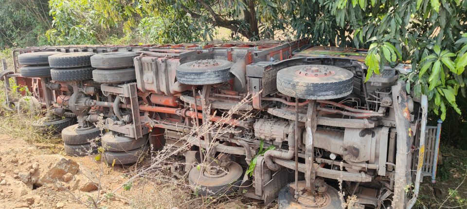 ଭାର ସାମ୍ୟ ହରାଇ ୧୦ଫୁଟ ତଳକୁ ଖସିଲା ଟ୍ରକ, ଅଳ୍ପକେ ବର୍ତ୍ତିଲେ ଚାଳକ ସହ ହେଲପର