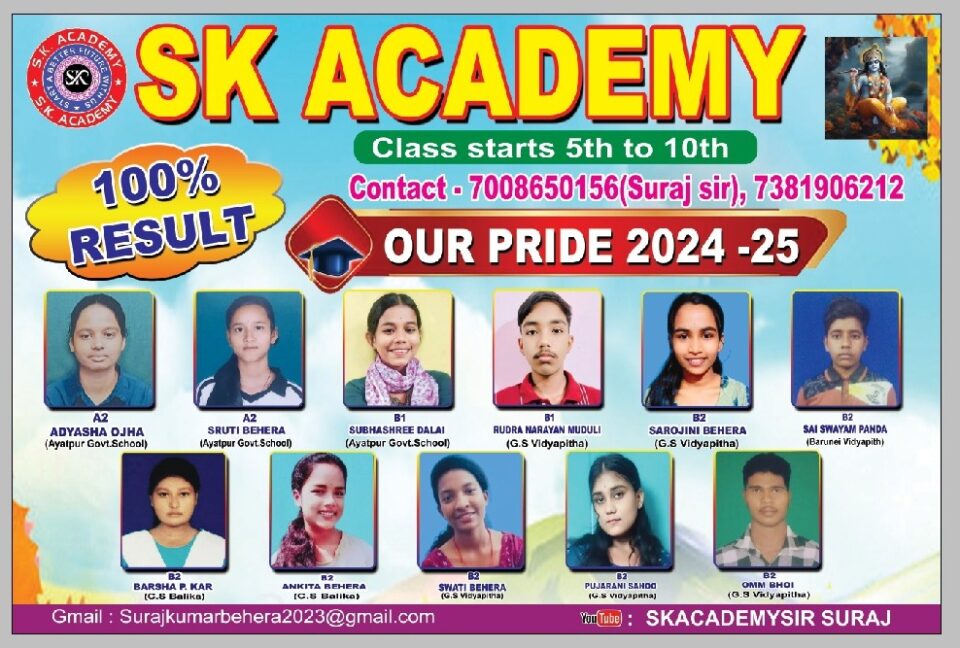 କଟକ : ମାଟ୍ରିକ ପରୀକ୍ଷା ଫଳ ପ୍ରକାଶ ପାଇ କଟକ ସଦର କନ୍ଦରପୁର ସ୍ଥିତ ଶିକ୍ଷାନୁଷ୍ଠାନ ଏସ୍କେ ଏକାଡେମୀର ଫଳାଫଳ ଅତ୍ୟନ୍ତ ଉଚ୍ଚମାନର ହୋଇଛି । ମୋଟ ୨୪ ଜଣ ପରୀକ୍ଷାର୍ଥୀ ମଧ୍ୟରୁ ଏ ୨ ଗ୍ରେଡରେ ୨ ଜଣ,ବି ୧ ଗ୍ରେଡରେ ୨ ଜଣ,ବି ୨ ଗ୍ରେଡରେ ୭ ଜଣ,ସି ଗ୍ରେଡରେ ୧୦ ଜଣ ଓ ଡି ଗ୍ରେଡରେ ୨ ଜଣ କୃତକାର୍ଯ୍ୟ ହୋଇଛନ୍ତି । ଏଥିରେ ଏ ୨ ଗ୍ରେଡରେ ଆୟତପୁର ସରକାରୀ ବିଦ୍ୟାଳୟର ଆଦ୍ୟାଶା ଓଝା ଓ ସୃତି ବେହେରା ସର୍ବାଧିକ ମାର୍କ ରଖିଥିବା ବେଳେ ବି ୧ ଗ୍ରେଡରେ ଶୁଭଶ୍ରୀ ବେହେରା ଓ ରୁଦ୍ରନାରାୟଣ ମୁଦୁଲି ଏବଂ ବି ୨ ଗ୍ରେଡ଼ରେ ସରୋଜିନୀ ବେହେରା ଉତ୍ତୀର୍ଣ୍ଣ ହୋଇଛନ୍ତି । ସେହିଭଳି ସାଇ ସୋୟମ ପଣ୍ଡା,ବର୍ଷା କର,ଅଙ୍କିତା ବେହେରା,ସ୍ଵାତୀ ବେହେରା,ପୂଜାରାଣୀ ସାହୁ ଓ ଓମ୍ ଭୋଇ ଶତକଡା ୬୦% ରୁ ଅଧିକ ନମ୍ବର ରଖିଛନ୍ତି । ଏସ୍କେ ଏକାଡେମୀର ମୁଖ୍ୟ ପରିଚାଳକ ଶିକ୍ଷାବିତ୍ ଇଂ.ସୁରଜ୍ କୁମାର ବେହେରା,ଶିକ୍ଷକ ବିଶିଷ୍ଟ ଶିକ୍ଷାବିତ୍ ରବି ନାରାୟଣ ସାହୁ,ସୋମନାଥ ବେହେରା,ପ୍ରଭାତ ମହାନ୍ତି,ସ୍ମୃତି ରଞ୍ଜନ ଦାସ,ଶୁଭମ୍ ମୁଦୁଲି ଓ ଶିକ୍ଷୟତ୍ରୀ ପ୍ରଜ୍ଞା ମିଶ୍ର ବିଦ୍ୟାର୍ଥୀଙ୍କୁ ଶୁଭେଛା ଜଣାଇବା ସହ ତାଙ୍କ ଉତ୍ତୋରତ୍ତର କାମନା କରିଛନ୍ତି ।