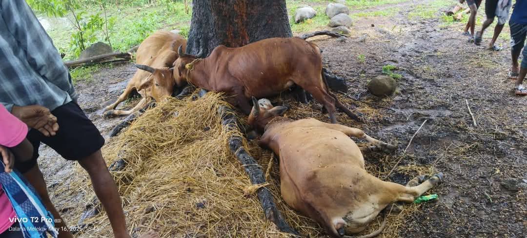 ବନ୍ଧୁଗାଁ ତା, ୧୬/୫/୨୫, ବନ୍ଧୁଗାଁ ବ୍ଲକ ଅନ୍ତର୍ଗତ କାନାଗାଁ ପଞ୍ଚାୟତ ର ରାମଜି ପୁଟ ଗାଁରେ ବଜ୍ର ପାତରେ ତିନି ବଳଦ ମୃତ I ମୃତ ବଳଦ ଗୁଡିକ ହେଲା କାନାଗାଁ ପଞ୍ଚାୟତର ରାମଜୀ ପୁଟ ଗାଁର ମେଲେକା କାୟୁ ଙ୍କ ର ବୋଲି ଜାଣିବାକୁ ମିଳିଛି I କାୟୁ ନିଜ କୁଡ଼ିଆ ନିକଟ ପାର୍ତିଙ୍ଗ ଯିବା ରାସ୍ତା କୋଡ଼ ତେନ୍ତୁଳି ଗଛ ମୂଳରେ ତିନି ବଳଦକୁ ବାନ୍ଦୀ ରଖିଥିଲେ I ଆଜି ଦିନ ୨ ଘଣ୍ଟା ସମୟରେ ବିଜୁଳି ଘଡ ଘଡ଼ି ସହ ଅଳ୍ପ ମାତ୍ରାରେ ବର୍ଷା ହୋଇଥିବାରୁ ଗଛ ନିକଟରେ ବଜ୍ରପାତ ପଡିଥିବାରୁ ତେନ୍ତୁଳି ଗଛ ମୂଳରେ ଥିବା ତିନି ବଳଦର ମୃତ୍ୟୁ ହୋଇଥିବା ଦେଖି କାୟୁ ପ୍ରାଣୀ ବିଭାଗ ଅଧିକାରିଙ୍କୁ ଖବର ଜଣେଇଥିଲେ I ଖବର ଶୁଣି ପ୍ରାଣୀ ବିଭାଗର କର୍ମୀ ଘଟଣା ସ୍ତଳରେ ପହଁଞ୍ଚି ତିନି ବଳଦକୁ ବ୍ୟବଛେଦ କରିଥିଲେ ଓ ଉକ୍ତ ଘଟଣା କୁ ନେଇ ପଞ୍ଚାୟତର ରାଜଶ୍ଵ ବିଭାଗର ଅଧିକାରୀଙ୍କୁ ଘଟଣା ବିଷୟରେ ଜଣାଇଲେ କିଛି ଆର୍ଥିକ ସହାୟତା ମିଳିପାରେ ବଲି ପ୍ରାଣୀ ବିଭାଗ ଅଧିକାରୀ ଉପଦେଶ ଦେଇଥିଲେ I ଏପଟେ ତିନି ବଳଦ ବଜ୍ର ପାତରେ ମରିଯିବାରୁ ଆଗକୁ ଚାଷ କରିବାରେ ଲଙ୍ଗଳ କରି ଜମିରେ ତୋଶିବା ସାହାଯ୍ୟ ହୋଉଥିଲା ବର୍ତମାନ ଏବେ ଜମିରେ କେମିତି ଲଙ୍ଗଳ କରିବି ବଲି କାୟୁ ଚିନ୍ତାରେ ପଡି ଦୁଃଖରେ ଗଣ ମାଧ୍ୟମକୁ ଜଣାଇଥିଲେ I