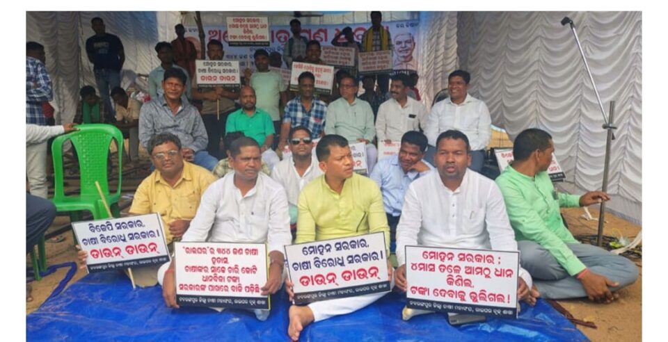 ଚାଷୀମାନଙ୍କୁ ତୁରନ୍ତ ଧାନ ବିକ୍ରୀ ଟଙ୍କା କରନ୍ତୁ ପୈଠ, ଧାନ କିଣା ଦୁର୍ନୀତି ବିରୁଦ୍ଧରେ ନବରଙ୍ଗପୁର ଜିଲ୍ଲା ଚାଷୀ ମହା ସଂଘ ପକ୍ଷରୁ ଧାରଣା ଅହୋରାତ୍ର ଜାରୀ