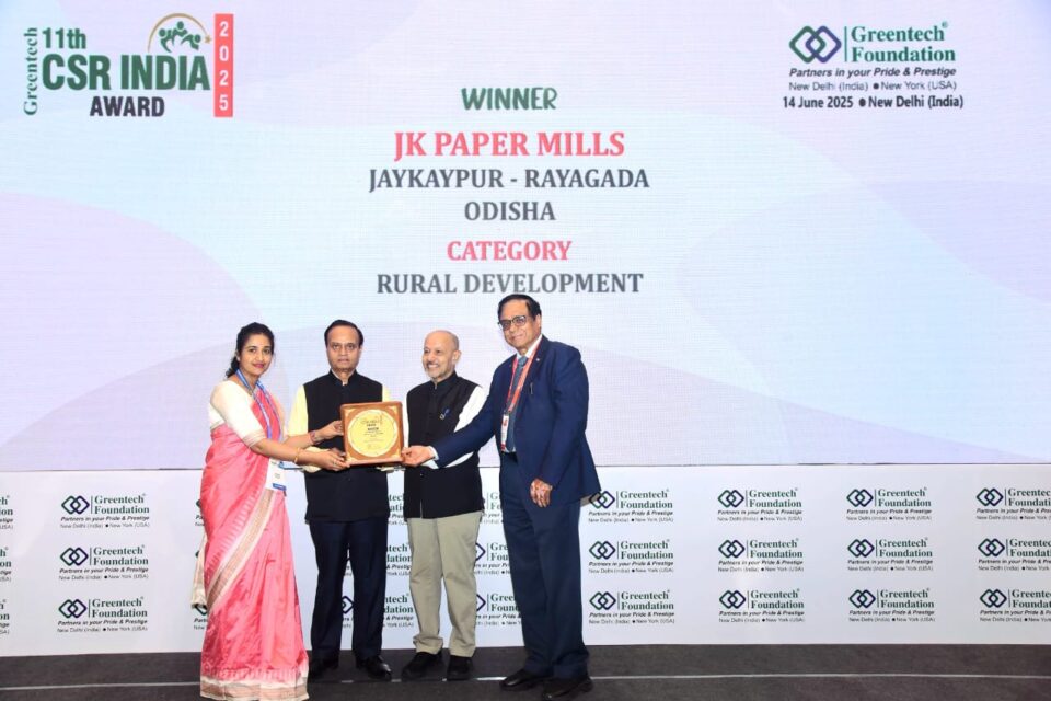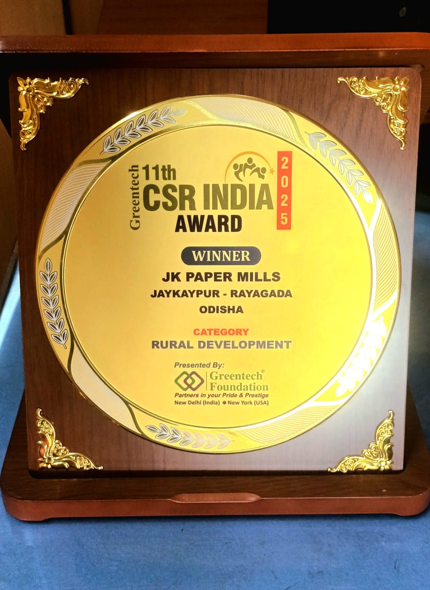 ଜେ କେ କାଗଜ କଳ , ରାୟଗଡା ପାରିପାର୍ଶ୍ଵିକ ଉନ୍ନୟନ ଏବଂ ପରିବେଶ ସୁରକ୍ଷା ପାଇଁ ଗ୍ରୀନଟେକ ସିଏସଆର ଆୱାର୍ଡ ରେ ସମ୍ମାନିତ