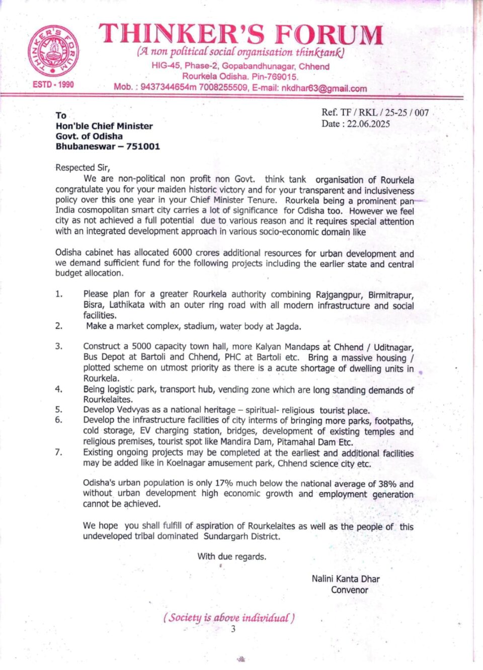 ରାଉରକେଲାର ବିକାଶ ପାଇଁ ମୁଖ୍ୟମନ୍ତ୍ରୀଙ୍କୁ ସ୍ମାରକ ପତ୍ର