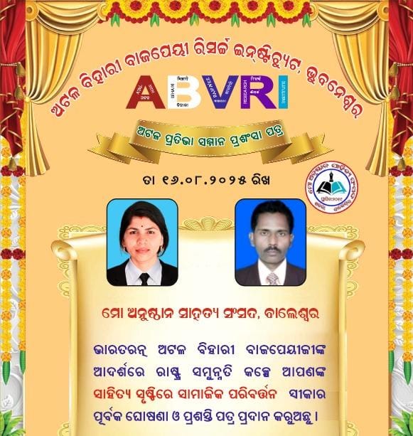 ମୋ ଅନୁଷ୍ଠାନ ସାହିତ୍ୟ ସଂସଦକୁ ମିଳିଲା ଅଟଳ ପ୍ରତିଭା ସମ୍ମାନ ପତ୍ର