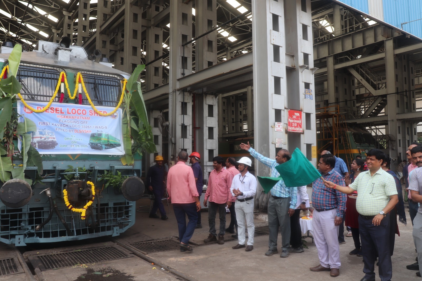 Rayagada/VSKP — In a major step towards enhancing railway safety, the first freight locomotive (WAG9HC) of East Coast Railway equipped with the indigenous KAVACH Train Collision Avoidance System (TCAS) was flagged off today from Diesel Loco Shed (DLS), Visakhapatnam. The locomotive was formally launched by Divisional Railway Manager, Waltair, Shri Lalit Bohra, in the august presence of Senior Divisional Mechanical Engineer (Diesel) Shri M.K. Sahoo and other senior officials.