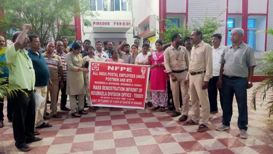ରାଉରକେଲା ତା ୧୬/୧୦/୨୦୨୫ — ରାଉରକେଲା ଡାକ ମଣ୍ଡଳର ପୋଷ୍ଟ ମ୍ୟାନ ଓ ଏମ୍ ଟି ଏସ କର୍ମଚାରୀ ମାନଙ୍କ ବିଭିନ୍ନ ସମସ୍ୟା ର ସମାଧାନ ଓ ୧୦ ଦଫା ଦାବିରେ ଆଜି ଅଲ୍ ଇଣ୍ଡିଆ ପୋଷ୍ଟାଲ ଏମ୍ପୋଇଜ ୟୁନିୟନ ପୋଷ୍ଟ ମ୍ୟାନ ଏଣ୍ଡ ଏମ୍ ଟି ଏସ ପକ୍ଷରୁ ରାଉରକେଲା ମୁଖ୍ୟ ଡାକଘର ସମ୍ମୁଖରେ ବିକ୍ଷୋଭ ପ୍ରଦର୍ଶନ କରିବା ସହିତ ଗତ ୨୯ ସେପ୍ଟେମ୍ବର ରେ ୟୁନିୟନ ପକ୍ଷରୁ ଡାକ ଅଧିକ୍ଷକ ଙ୍କୁ ଦାବିପତ୍ର ଦିଆଯାଇଥିଲା ବେଳେ ଏହାକୁ କର୍ଣ୍ଣପାତ କରୁ ନ ଥିବାରୁ ଓ ଦାବିକୁ ଅଣଦେଖା କରିବା ବିରୋଧରେ ଡାକ ଅଧିକ୍ଷକ ଙ୍କ ଟାଳଟୁଳ ନୀତି ପ୍ରତିବାଦରେ ଆଜି ୟୁନିୟନ ପକ୍ଷରୁ ବିକ୍ଷୋଭ ପ୍ରଦର୍ଶନ କରାଯାଇଛି।