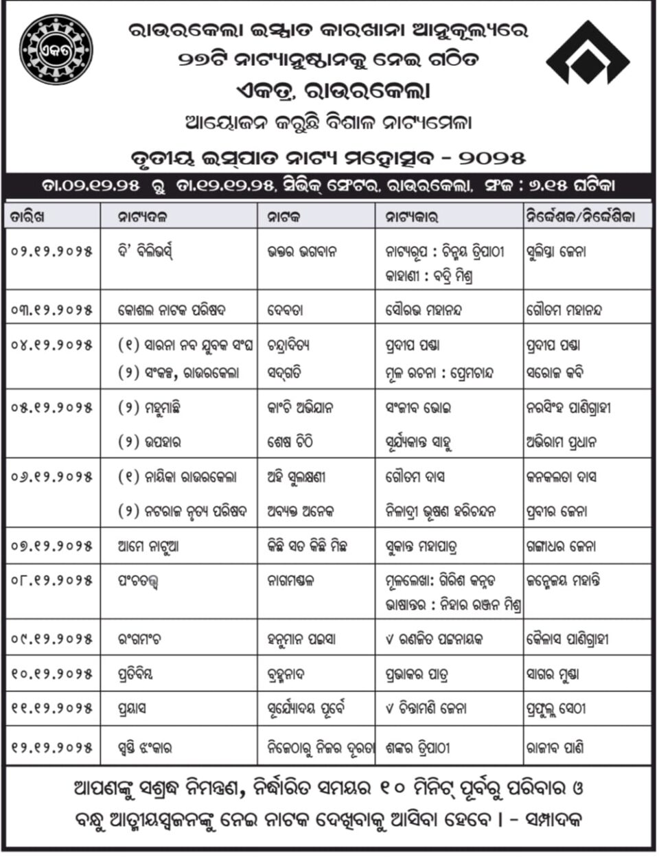 ତୃତୀୟ ଇସ୍ପାତ ନାଟ୍ୟମହୋତ୍ସବ ୨୦୨୫ ଡିସେମ୍ବର ୨ ରୁ…..