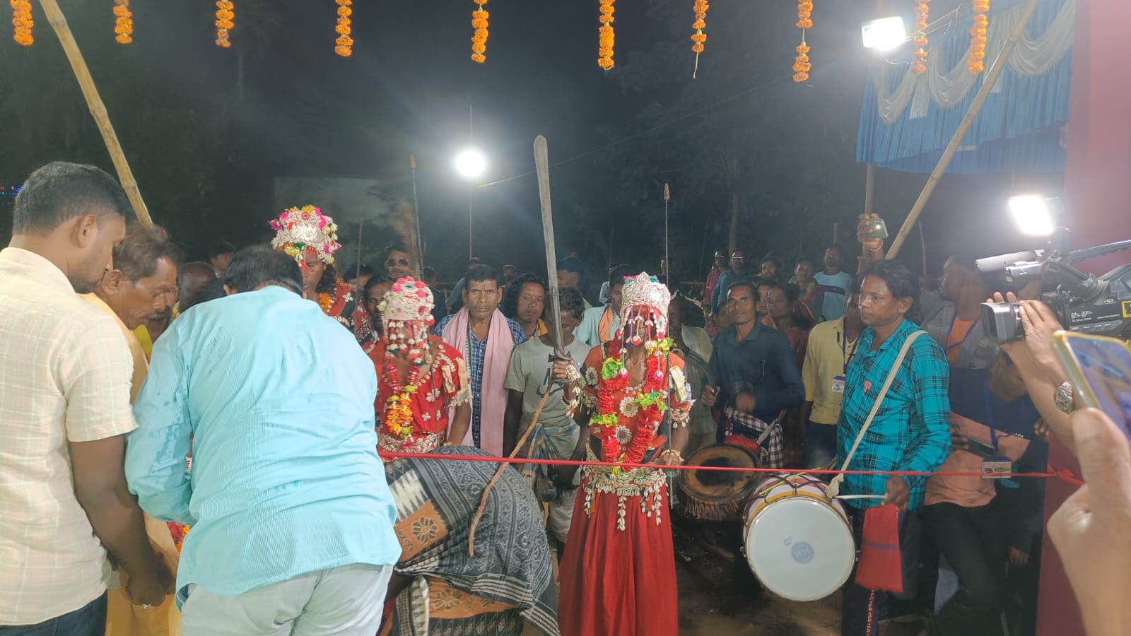 ପୀଠରେ ରକ୍ତ ଭୋଗ ଅର୍ପଣ କରିଥିଲେ। ମନ୍ଦିରରେ ପୂଜା ପରେ ସନ୍ଧ୍ୟାରେ ଦେବୀଙ୍କ ଲାଠି କାଲିଶୀମାନେ ନାଗରା, ମହୁରୀ, ବଜା ବଜାଇ ଦଶରା ମହୋତ୍ସବର ସାଂସ୍କୃତିକ ମଞ୍ଚ ନିକଟକୁ ପହଞ୍ଚି ଥିଲେ। ପୂଜାର୍ଚ୍ଚନା ପରେ ମଞ୍ଚ ଉପରକୁ ଦେବାଦେବୀ ପଦାର୍ପଣ କରିଥିଲେ। ପରେ ଘାଟିମୁଣ୍ଡିଆଣୀ ମା’ ସର୍ବମଙ୍ଗଳା ବିଭିନ୍ନ ଦେବୀଙ୍କ ରୁପରେ ଶ୍ରଦ୍ଧାଳୁ ମାନଙ୍କୁ ଦର୍ଶନ ଦେଇଥିଲେ। ଦେବୀଙ୍କ ଦର୍ଶନ ପାଇ ଶ୍ରଦ୍ଧାଳୁ ଓ ଦର୍ଶକମାନେ ମଙ୍ଗଳ କାମନା କରି ଆଶୀର୍ବାଦ ଭିକ୍ଷା କରିଥିଲେ।