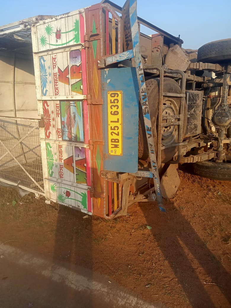 ଭାରସାମ୍ୟ ହରାଇ ରାସ୍ତା ପାର୍ଶ୍ୱକୁ ଓଲଟିଲା କୁକୁଡ଼ା ଛୁଆ ବୋଝେଇ ପିକଅପ:ଅଳ୍ପକେ ବର୍ତ୍ତିଲେ ଚାଳକ