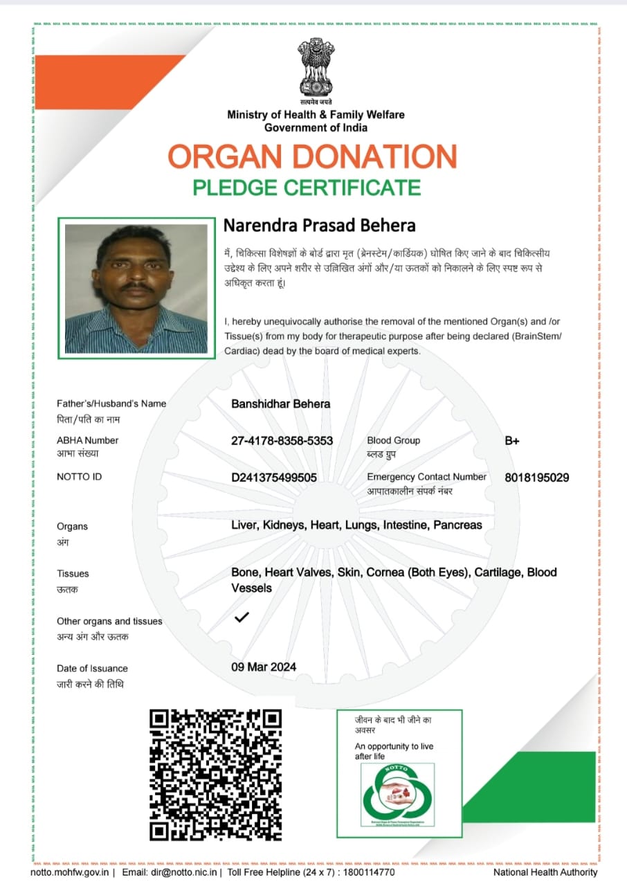 ବାଲେଶ୍ଵର,୦୯/୩/୨୪- ବାଲେଶ୍ଵର ଜିଲ୍ଲା ଖଇରା ବ୍ଲକ ଖଇରା ପଞ୍ଚାୟତ ଆଳଦା ଗ୍ରାମର କବି, ସାହିତ୍ଯିକ, ସାହିତ୍ୟ ଅନୁଷ୍ଠାନର ପ୍ରତିଷ୍ଠାତା ଓ ସମ୍ପାଦକ, ସମାଜସେବକ ଏବଂ ବିଭିନ୍ନ ସାହିତ୍ୟ ଓ ସମାଜସେବା ଅନୁଷ୍ଠାନ ସହିତ ଜଡିତ ଥିବା ନରେନ୍ଦ୍ର ପ୍ରସାଦ ବେହେରା ତା ୦୯/୩/୨୦୨୪ ରିଖ ଶନିବାର ନିଜର ସମ୍ପୂର୍ଣ୍ଣ ଶରୀରକୁ ଭାରତ ସରକାରଙ୍କ ସ୍ବାସ୍ଥ୍ୟ ଓ ପରିବାର କଲ୍ଯାଣ ବିଭାଗକୁ ଦାନ କରିଦେଇଛନ୍ତି । ମୃତ୍ୟୁ ପରେ ଶରୀର କୌଣସି ଅଙ୍ଗ ପ୍ରତ୍ଯଙ୍ଗ ଯଦି କାହାରି କାର୍ଯ୍ୟରେ ଲାଗି ପାରିବ ସେହି ସମାଜସେବା କାର୍ଯ୍ୟ ନିମନ୍ତେ ଏଭଳି ପଦକ୍ଷେପ ନେଇ ନିଜକୁ ଧନ୍ୟ ମନେକରିଛନ୍ତି ଶ୍ରୀ ବେହେରା । ଏ ଖବର ପ୍ରଚାରପ୍ରସାର ପରେ ସବୁ ଦିଗରୁ ପ୍ରଶଂସା ଓ ଅଭିନନ୍ଦନର ସୁଅ ଛୁଟିବାରେ ଲାଗିଛି । ମୋ ମୃତ୍ୟୁ ପରେ ମୋ ଶରୀର ସମାଜସେବାରେ ଲାଗିଲେ ମୋର ଆତ୍ମା ଶାନ୍ତି ପାଇବ ବୋଲି ସମସ୍ତଙ୍କୁ ମନରକଥା ଖୋଲି କହିଛନ୍ତି ଶ୍ରୀ ବେହେରା ।।